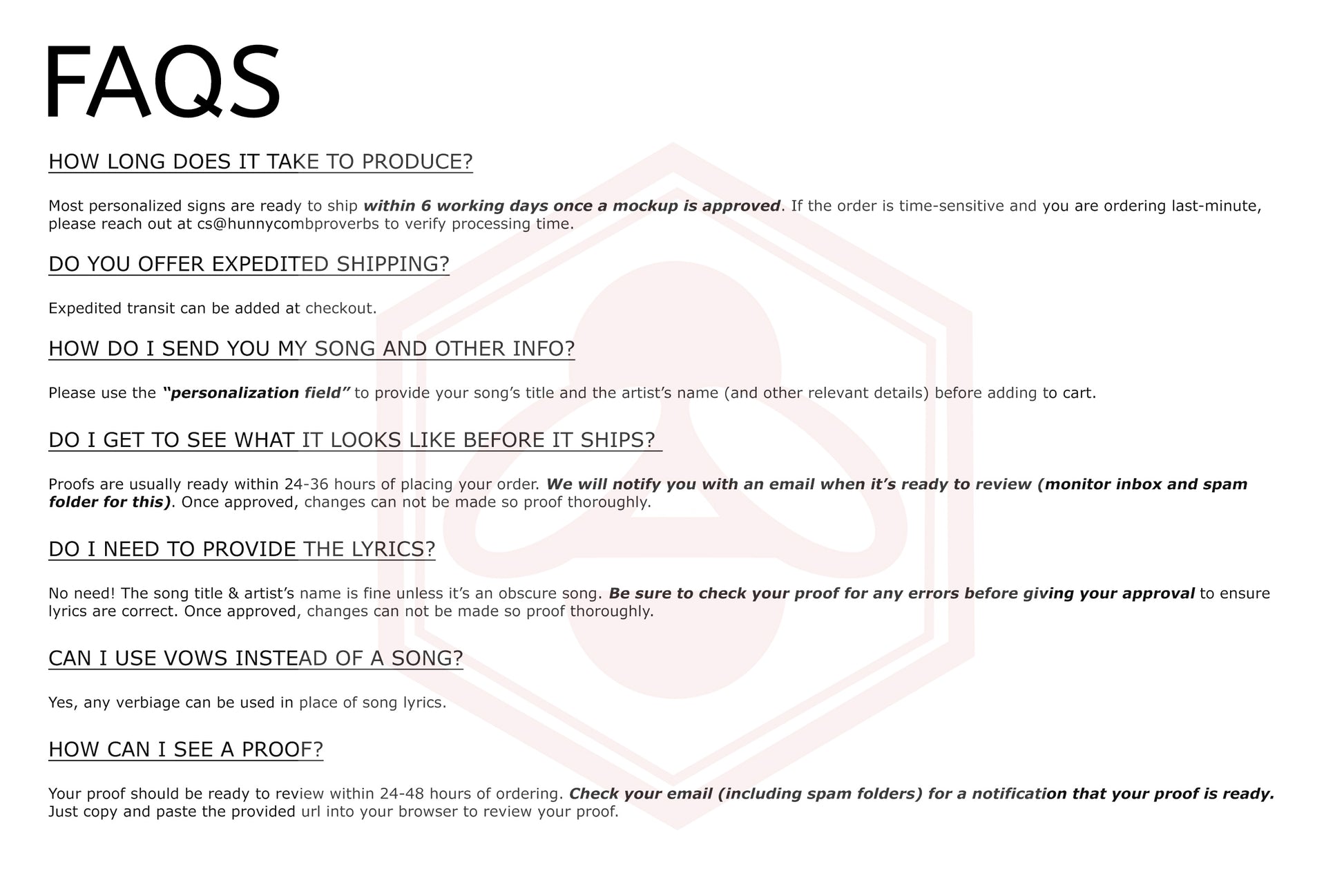 Song Lyrics: Provide the artist/song title in the personalized field and we will be happy to source the lyrics for you. During the proofing process you can review for errors to ensure we have the correct version of your song. If you prefer to provide the lyrics, you can use the notes field at checkout or email them to us at cs@hunnycombproverbs.com