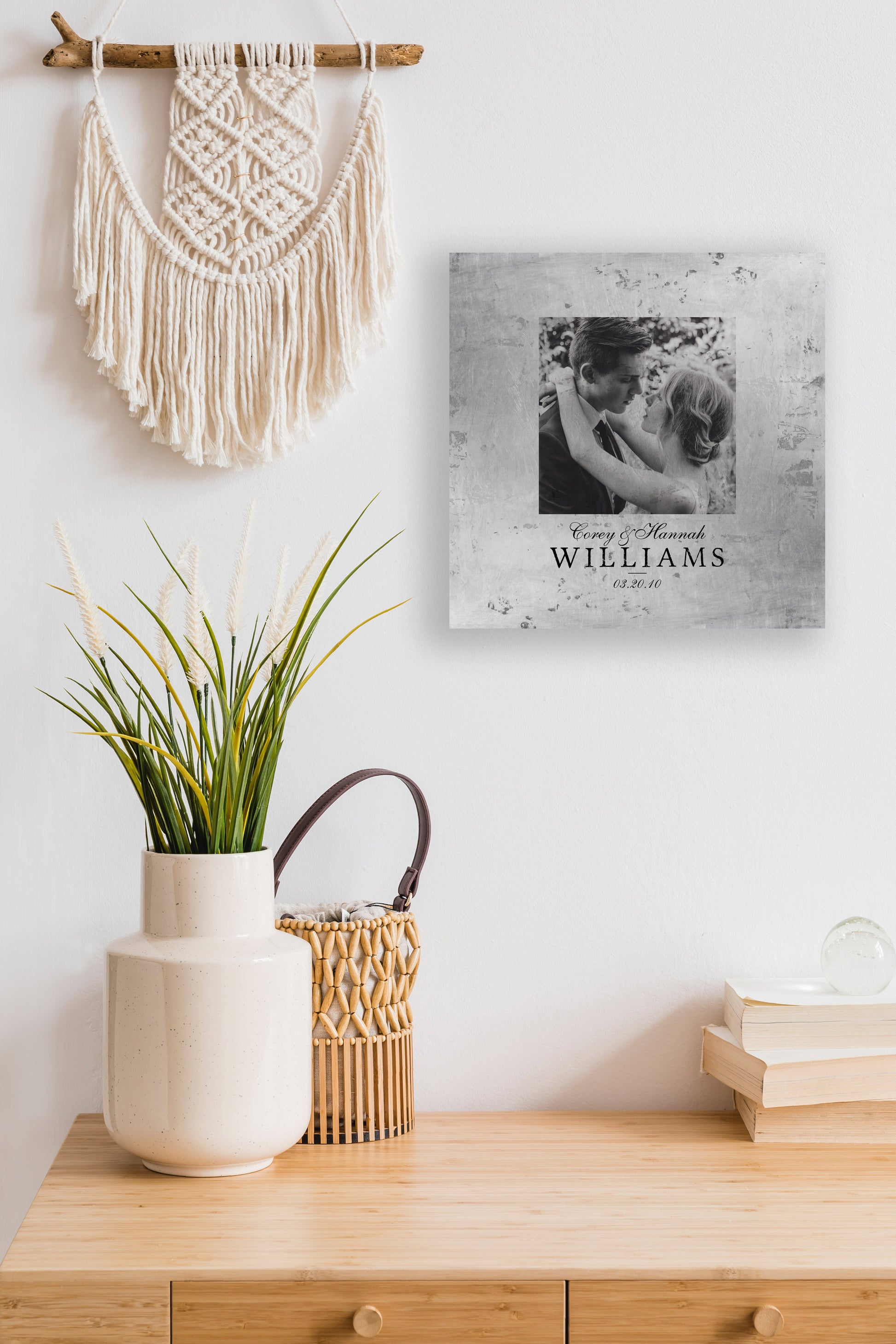 Tin photo anniversary gift featuring the photo of your choice, and marked with the couple's names and union date. Industrial, and distressed style tin photo gifts are sure to impress. This piece is modern and rustic all at the same time. Makes a great anniversary gift for him or her. This custom keepsake on metal fits beautifully in any space. This year, give a unique and meaningful 10 year anniversary gift or wedding gift. Just provide the names, wedding date, pick a font style and add one to your cart. Makes a perfect "aluminum" anniversary gift too! Each piece is a blend of aluminum/tin and made from 100% recycled materials.
