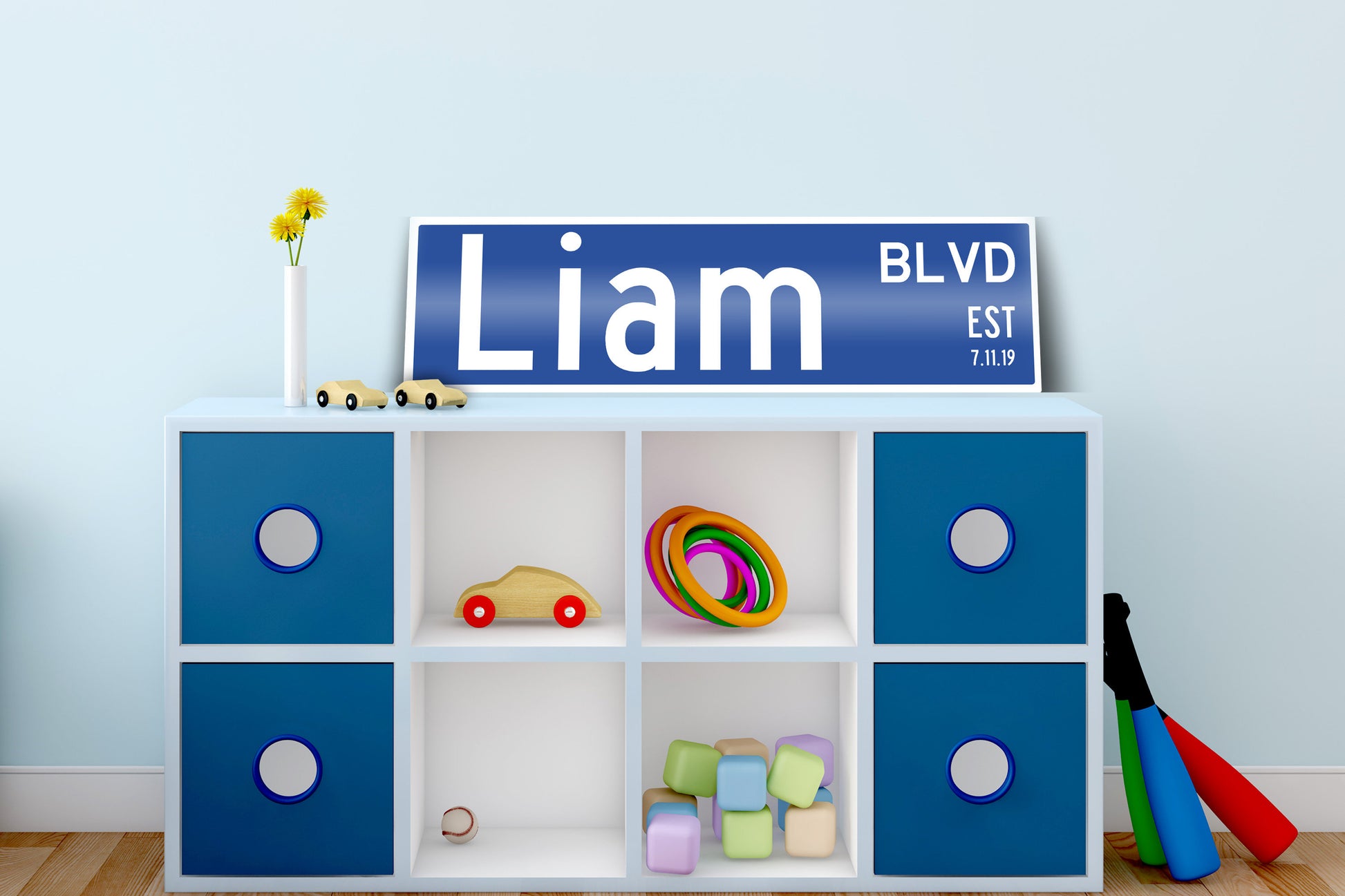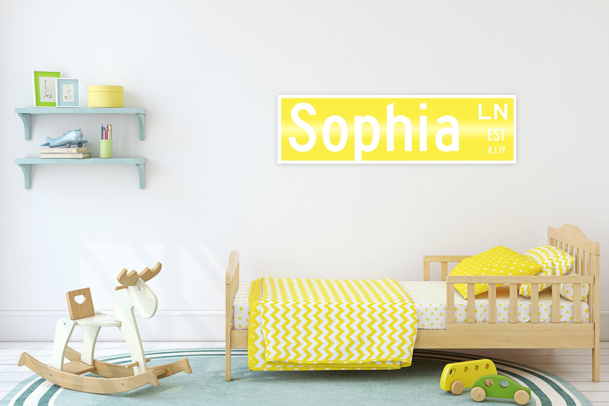 The perfect addition to any child's bedroom, playroom or nursery. This aluminum print is customized with any first name and birth date. Add a road designation such as Court, or Boulevard too! Available as a ready to hang sign or as a panel only option, perfect for dresser tops or shelves.