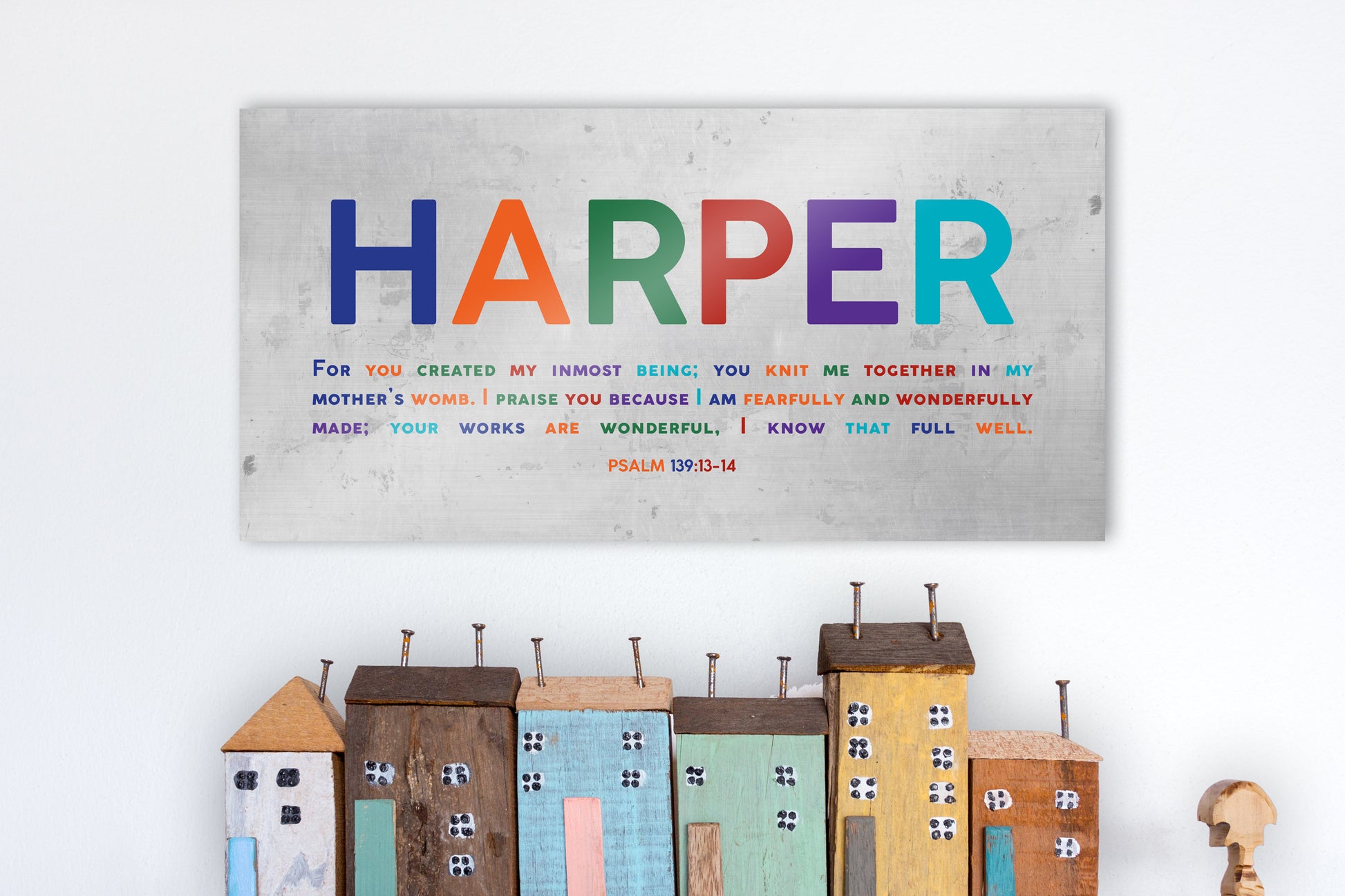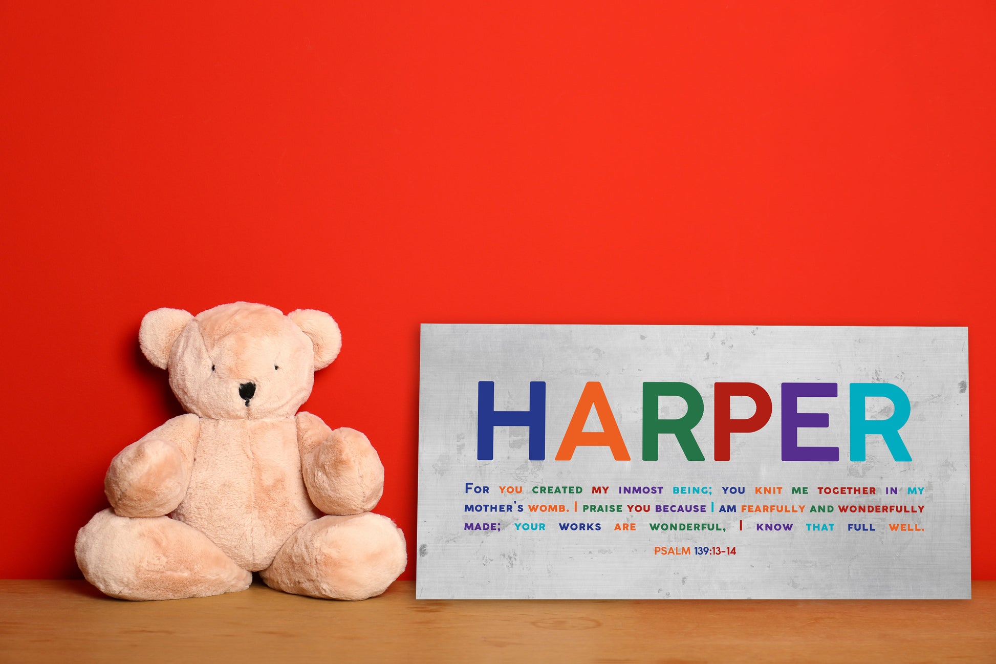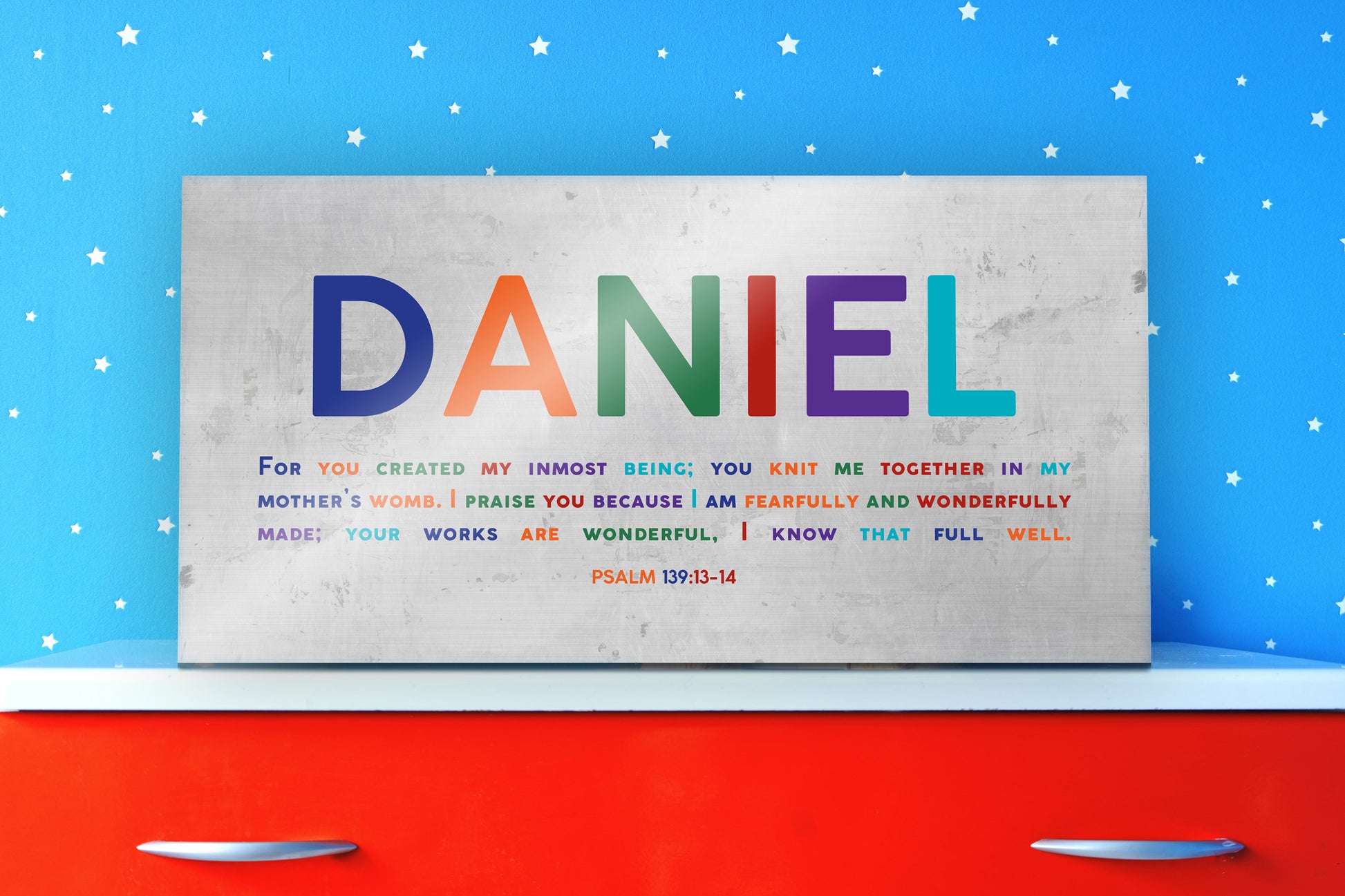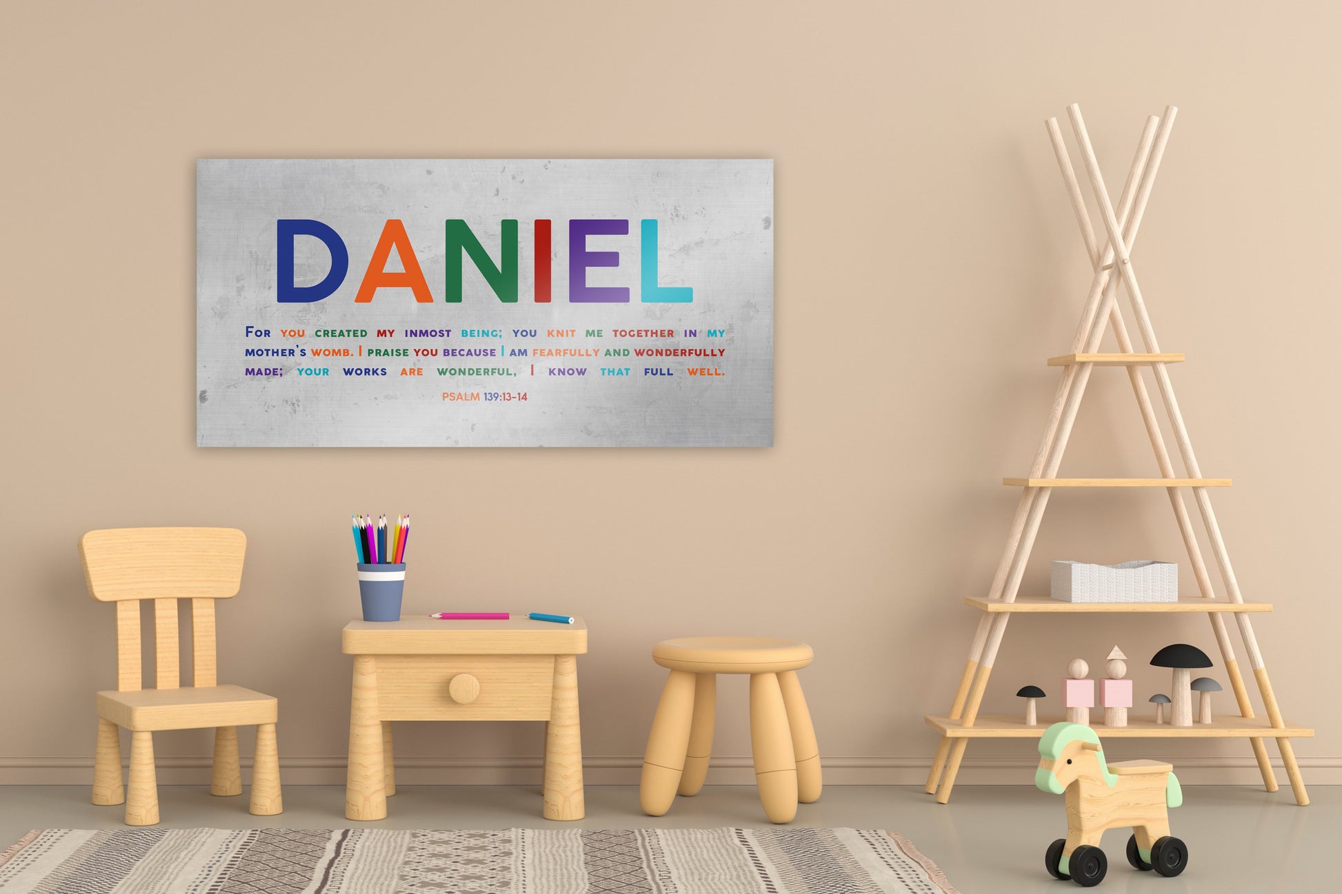 Children's wall decor with Psalms 138:13-14. Custom Rustic Christian Decor for kids - Aluminum metal Children's sign has a unique distressed look and features the words of Psalm 139:13-14. This bible verse Metal Sign for kids is also a personalized name sign.
