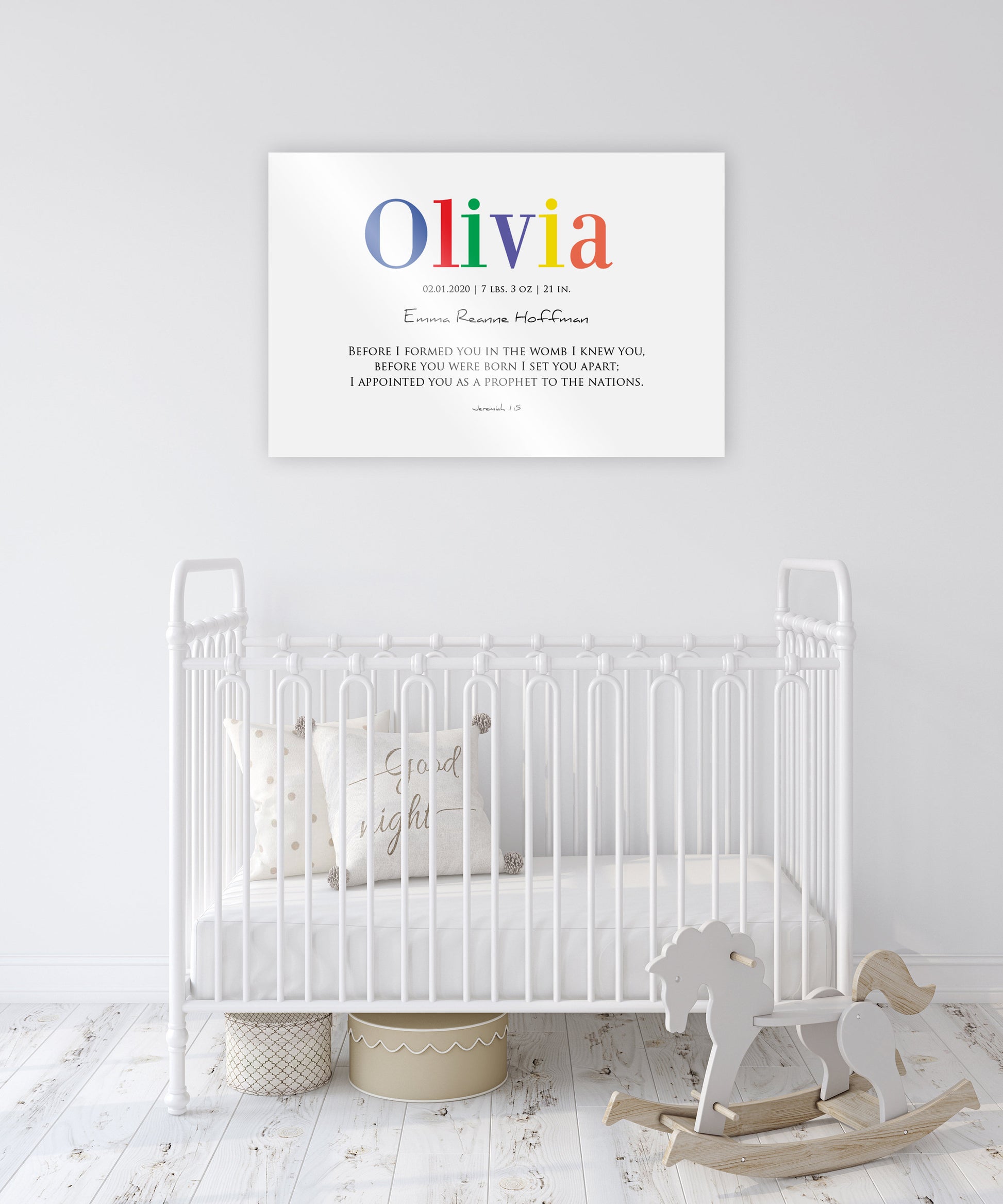Colorful Aluminum metal Children's sign has a unique look with a white base tone. Available in a variety of display options, this christian decor features Jeremiah 1:5 and is personalized with their name, birthday, height and birth weight. Colorful and inspirational, this piece makes a great gift for any new parents or the perfect addition to a nursery or play area. Printed on 100% recycled aluminum/tin. Also 100% recyclable and friendly to the environment.