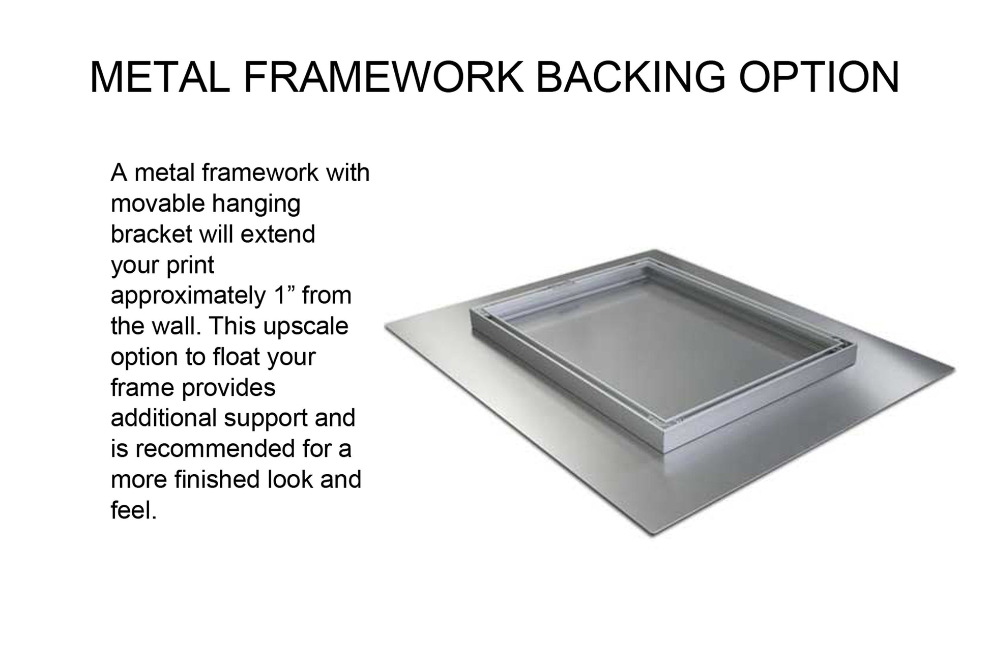 • Two hanging options: Choose from Gatorboard Float backing for an economical hanger, or Metallic Inset-Frame backing for a more finished look and feel.
