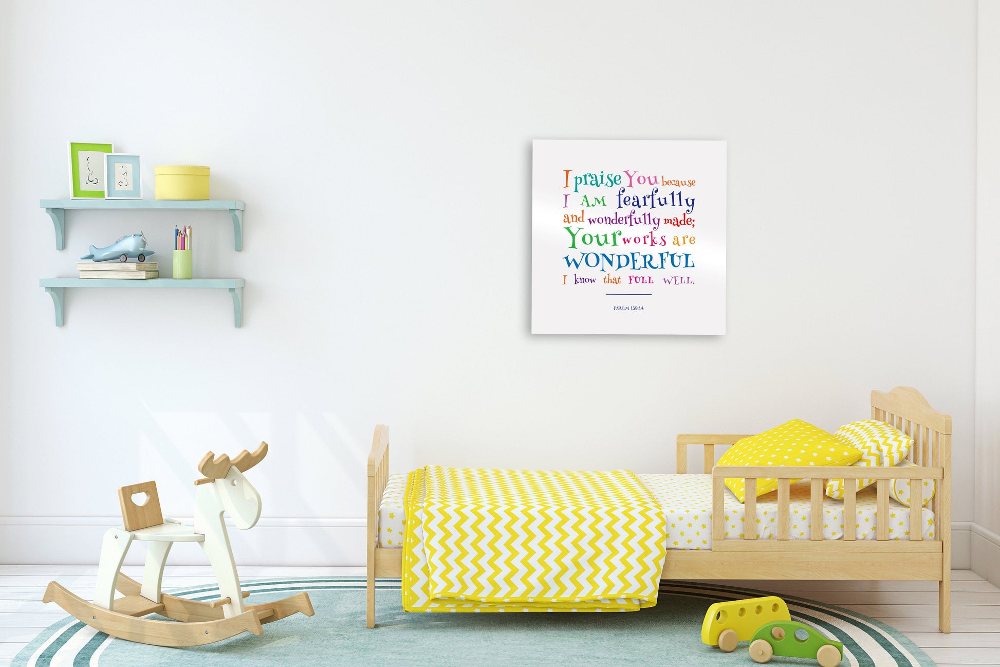 Kids Bible Verse wall on metal is modern and fun. Colorful options feature a fun, playful typeface. This is the finest in metal printing, durable and fade-resistant. Available in 2 color options, Multi-color on a silver aluminum background, or Multi-color on white, this adorable kid's Christian decor is available as a panel only, or as a ready to hang sign with a float-mount backing. And children won't be left wondering what they are reading with the kid-friendly NIV translation, "I praise you because I am fearfully and wonderfully made; your works are wonderful, I know that full well".