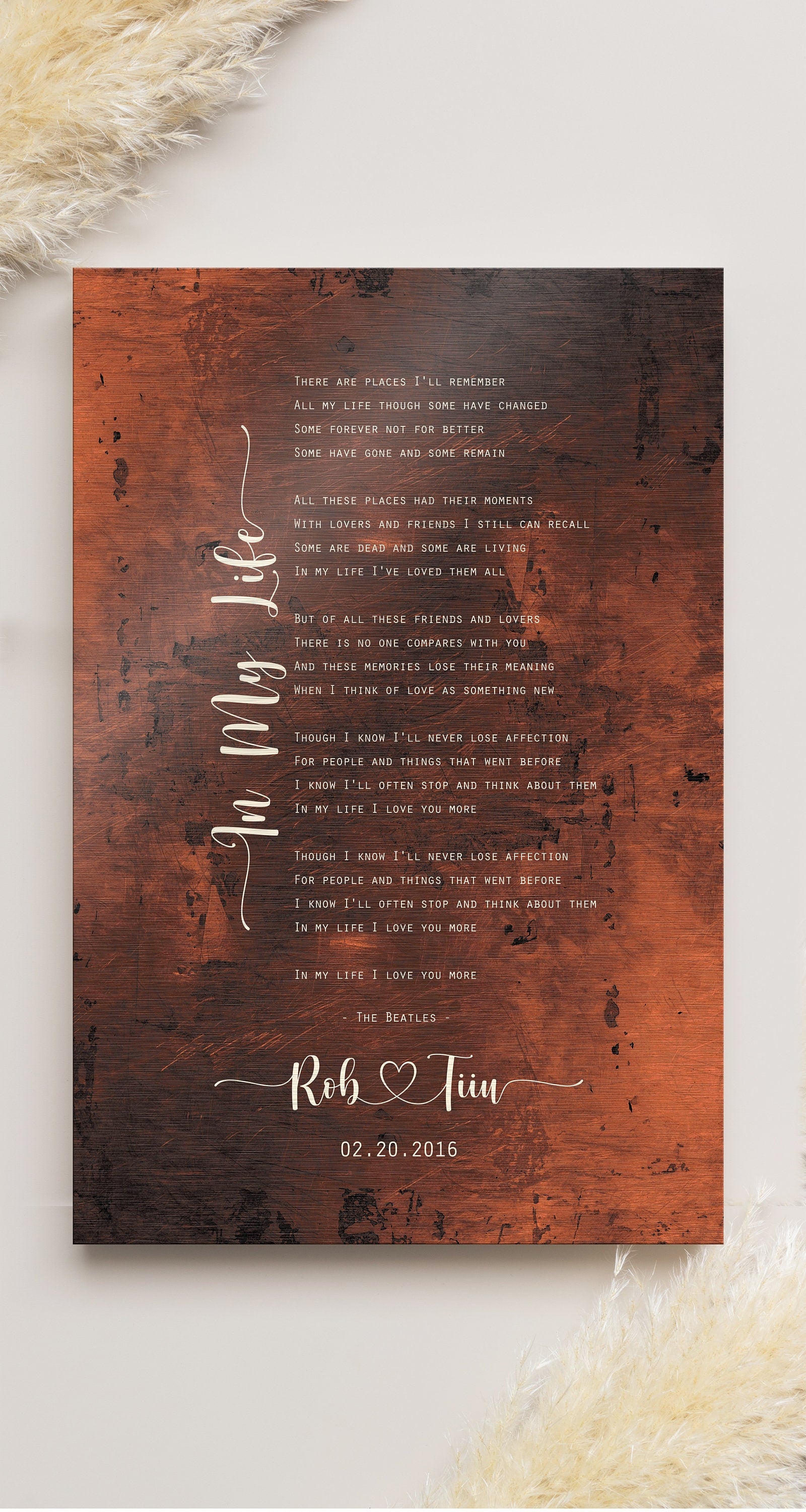 Celebrate 8 years of love with our personalized Bronze Anniversary Gift. Whether it's for him or her, this whimsical Song Lyric Sign pays tribute to your special melody - your wedding song, first dance, or any cherished tune.
