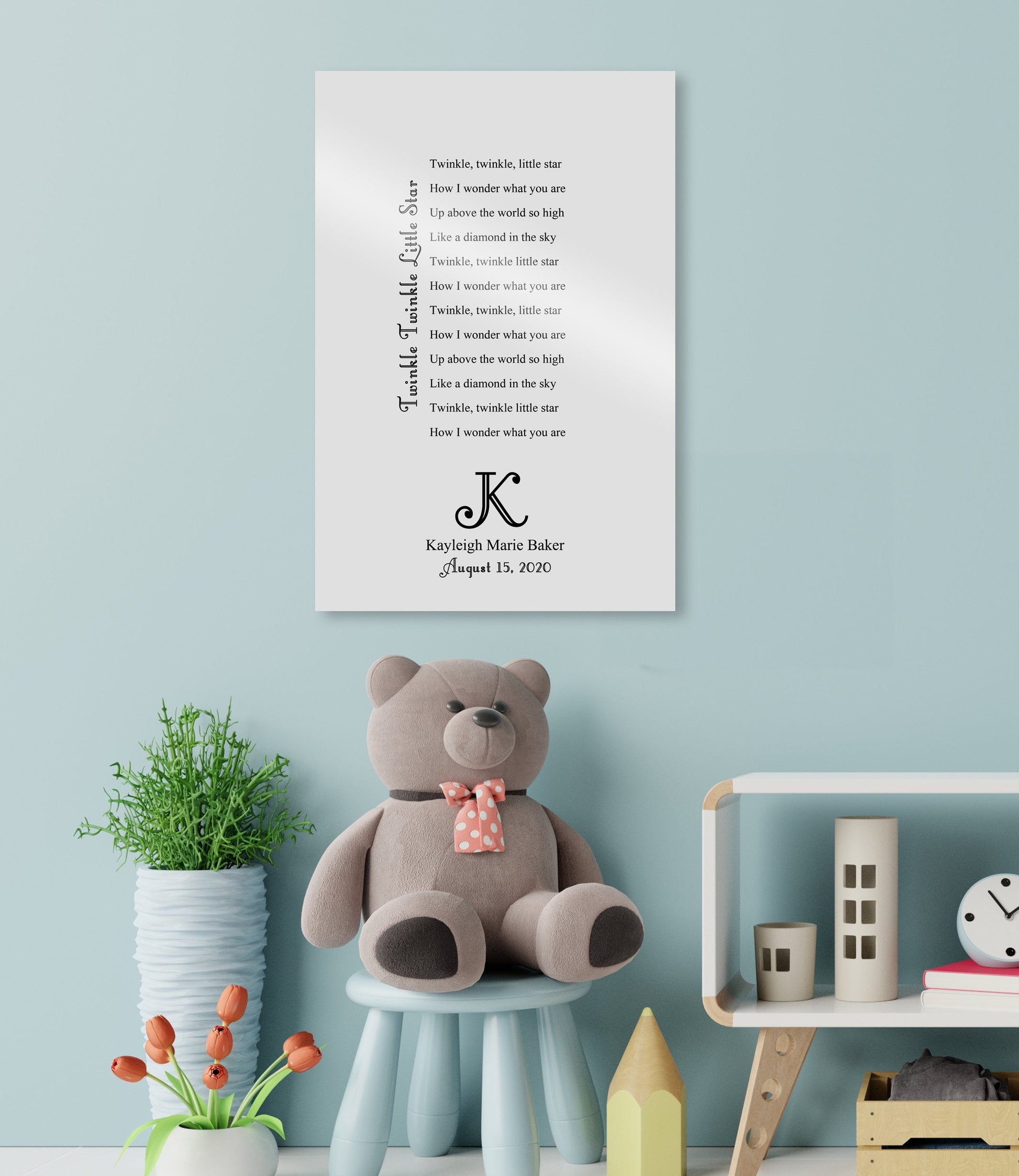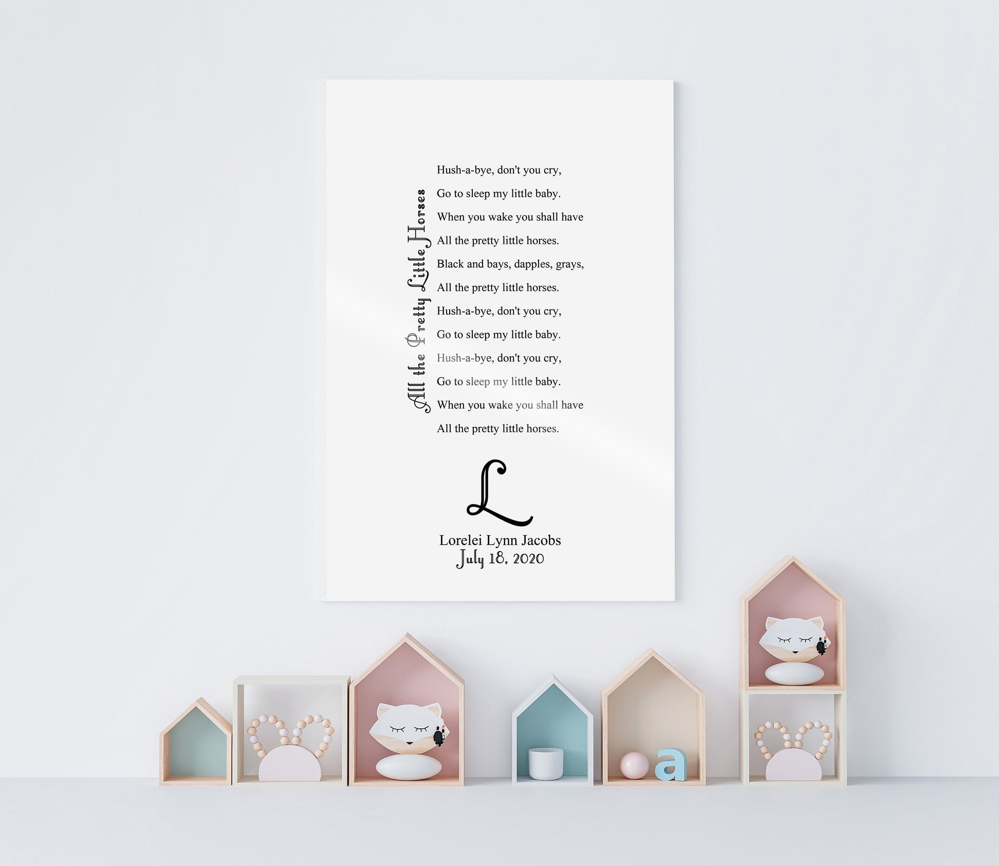 Lullaby Themed, Custom Name Sign is perfect for baby's room. Features their name, birth date, a monogram, and the lullaby, song, or wording of your choice. Delicate and unique, this piece makes a unique and cherished gift for any new parents and goes great with any decor.