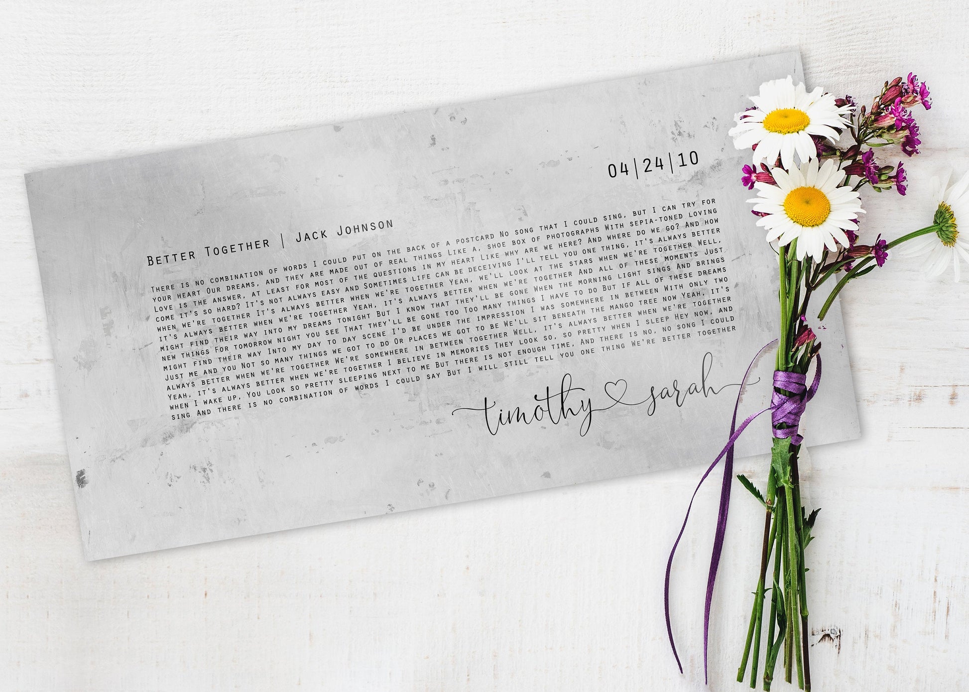 Got the poem I wrote for our wedding printed on tin for a gift for my husband for our 10 year wedding anniversary. It turned out beautiful and really is such an unusual piece. Communication with Noelle was quick, easy and seamless.