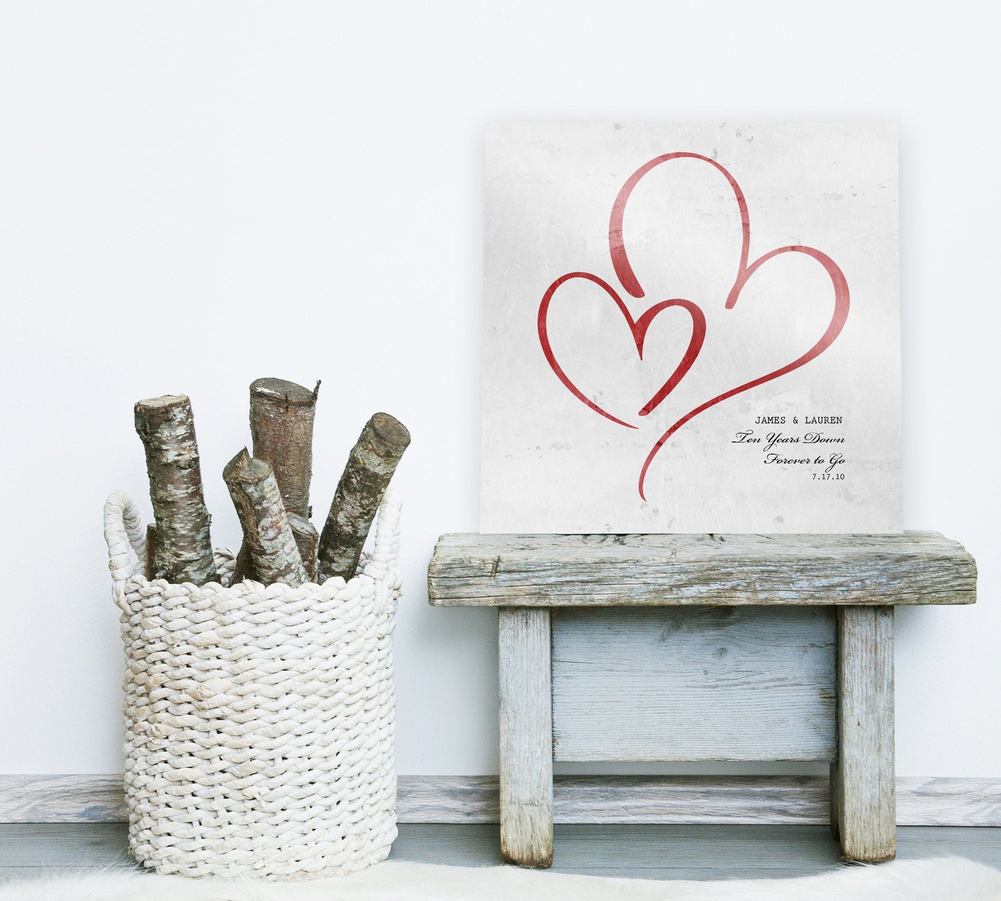 Ten Years Down, Forever to go! Distressed, Tin anniversary gift featuring a sweet double heart in black or wine (or the color of your choice), and marked with the couple's names and union date. Industrial, and distressed style tin gifts are sure to impress. This piece is modern and rustic all at the same time. Makes a great anniversary gift for him or her. This custom keepsake on metal fits beautifully in any space. This year, give a unique and meaningful 10 year anniversary gift or wedding gift. Just provide the names, wedding date, pick a color and style and add one to your cart. Makes a perfect "aluminum" anniversary gift too! Each piece is a blend of aluminum/tin and made from 100% recycled materials.
