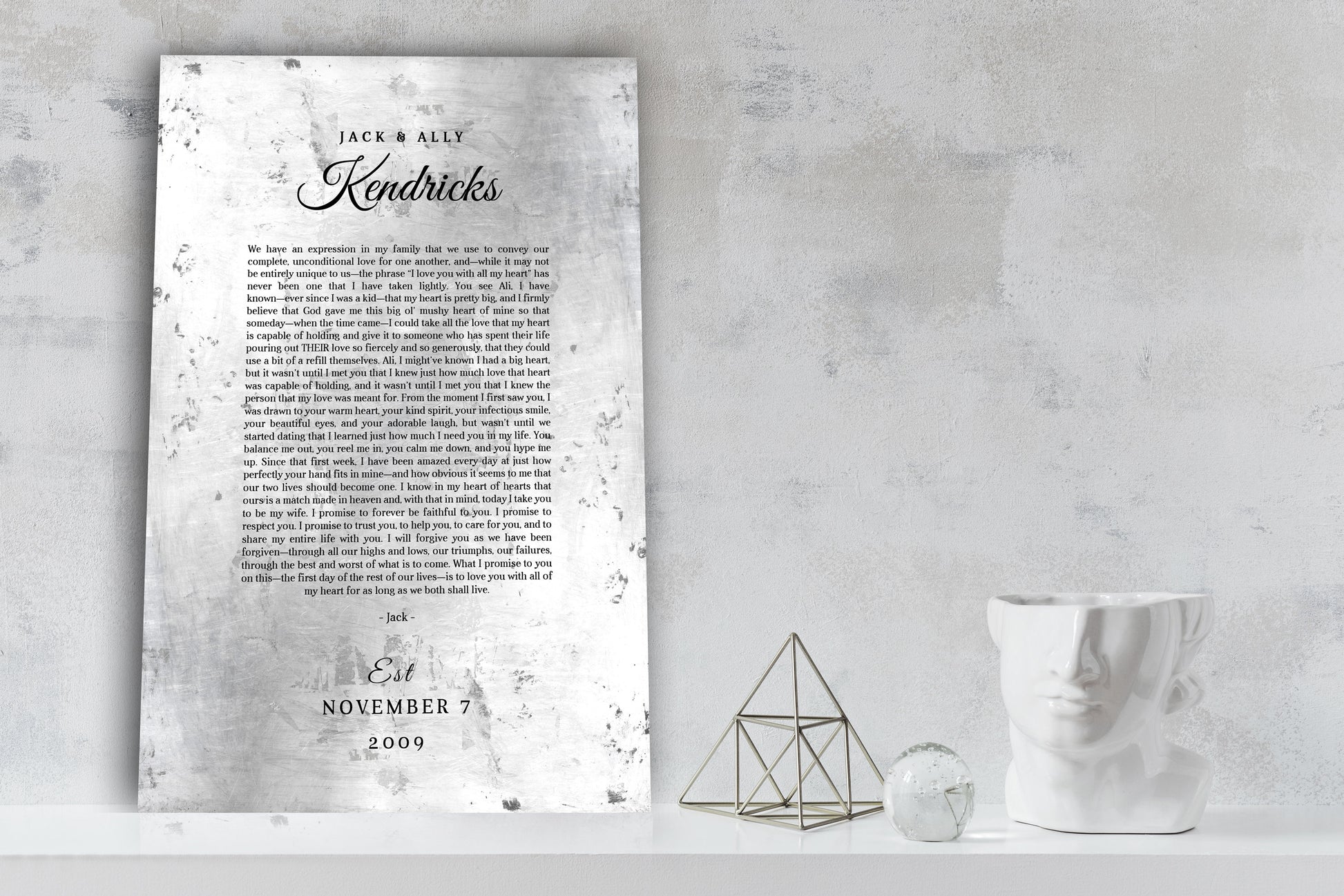 Printed Wedding Vows on Tin - Rustic, industrial farmhouse style custom wall decor. This aluminum/metal print is personalized with your vows, song, or wording, and also features names and dates to create the perfect custom-made tin anniversary gift. Perfect for the new couple, or as a tin gift for 10th anniversary. Choose from 3 display options. Ready to hang options available for a gift that's ready to display, right out of the box.